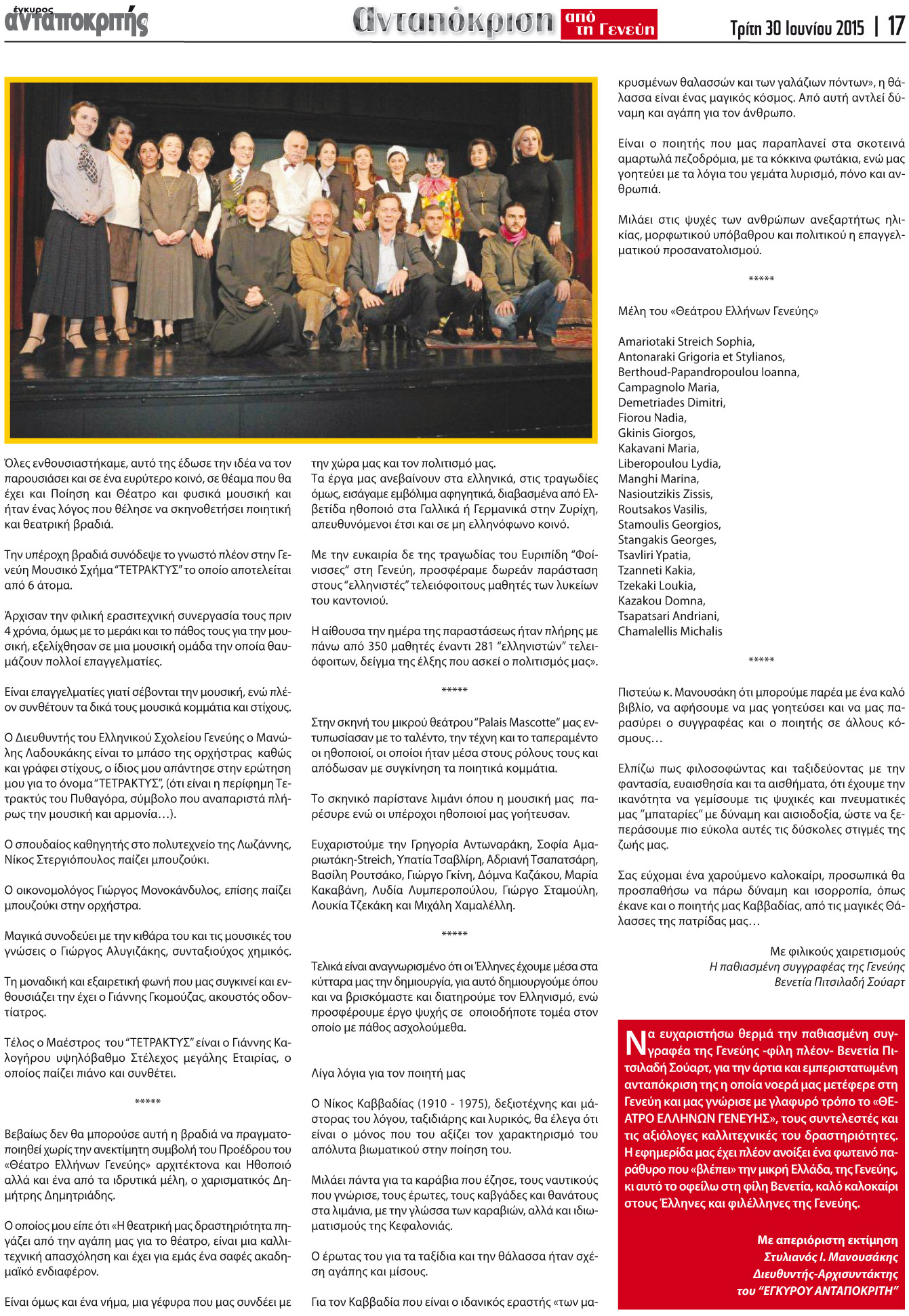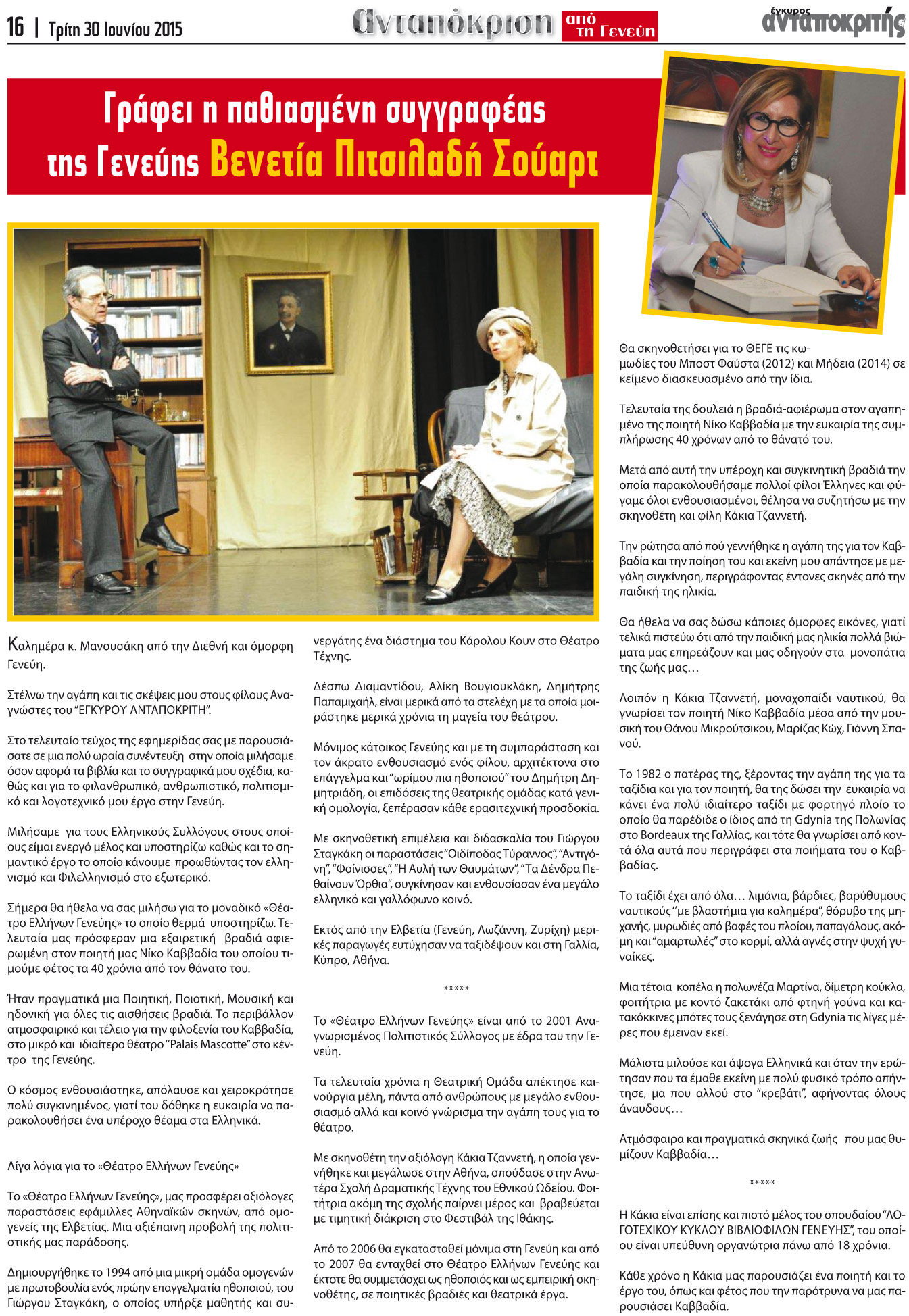 Σήμερα θα ήθελα να σας μιλήσω για το μοναδικό «Θέατρο Ελλήνων Γενεύης» το οποίο θερμά υποστηρίζω. Τελευταία μας πρόσφεραν μια εξαιρετική βραδιά αφιερωμένη στον ποιητή μας Νίκο Καββαδία του οποίου τιμούμε φέτος τα 40 χρόνια από τον θάνατο του.