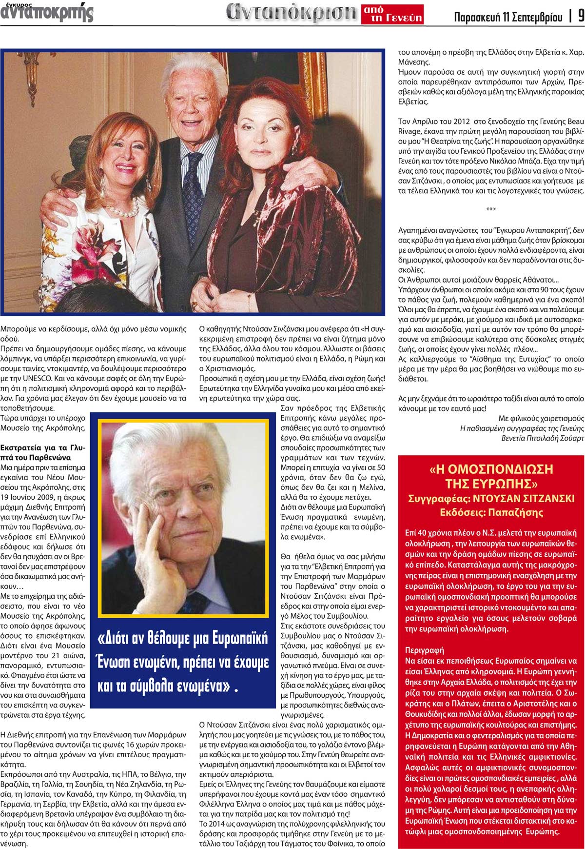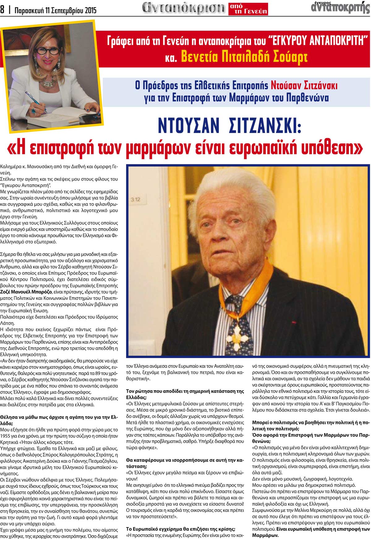 Η ανταποκρίτρια του Έγκυρου Ανταποκριτή από τη Γενεύη, κ. Βενετία Πιτσιλαδή Σούαρτ, μιλάει με τον Ντούσαν Σιτζάνσκι, Πρόεδρο της Ελβετικής Επιτροπής για την επιστροφή των Μαρμάρων του Παρθενώνα.