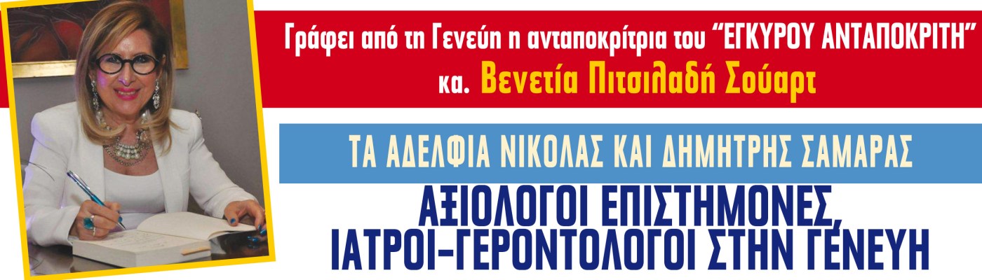 Η συγγραφέας κ. Βενετία Πιτσιλαδή Σούαρτ, ως ανταποκρίτρια τής εφημερίδας του Έγκυρου Ανταποκριτή από τη Γενεύη, συνομιλεί με τα αδέλφια Νικόλα και Δημήτρη Σαμαρά, ιατρούς παθολόγους και γηριάτρους που ασκούν το επάγγελμά τους στη Γενεύη ιδιωτικά αλλά και ως επιστημονικοί συνεργάτες του πανεπιστημιακού νοσοκομείου της Γενεύης.