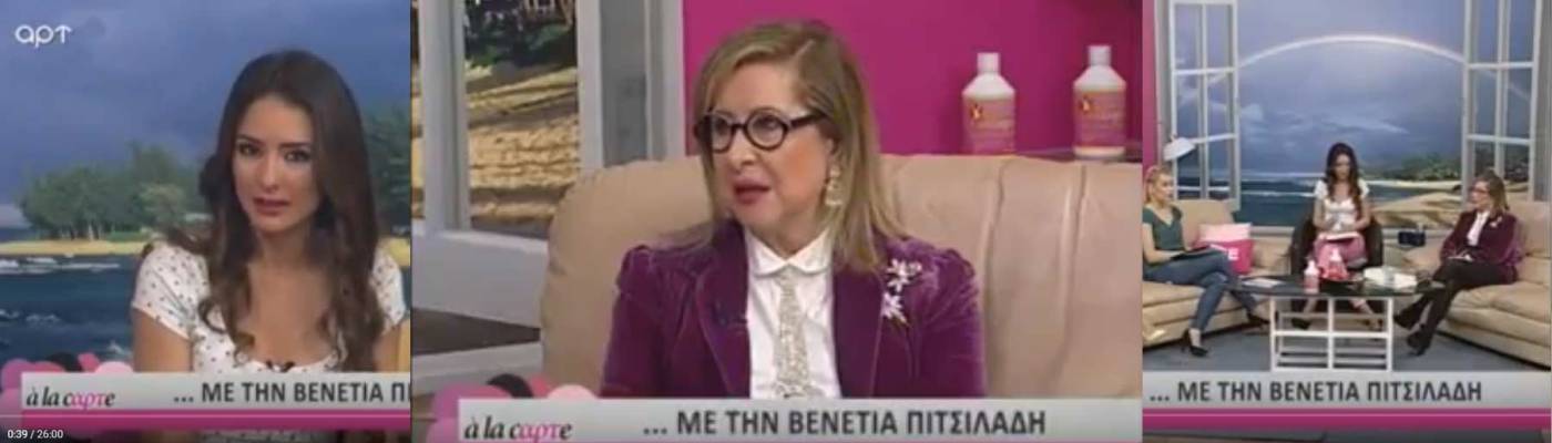 Η συγγραφέας Βενετία Πιτσιλαδή – Chuard μιλάει στην εκπομπή a la cαρτe στο κανάλι art και στις δημοσιογράφους Ελευθερία Νταβατζή, Φένια Παλαιογιάννη, Φρόσω Σιδηροκαστρίτη και Κλάρα Ασημακοπούλου.