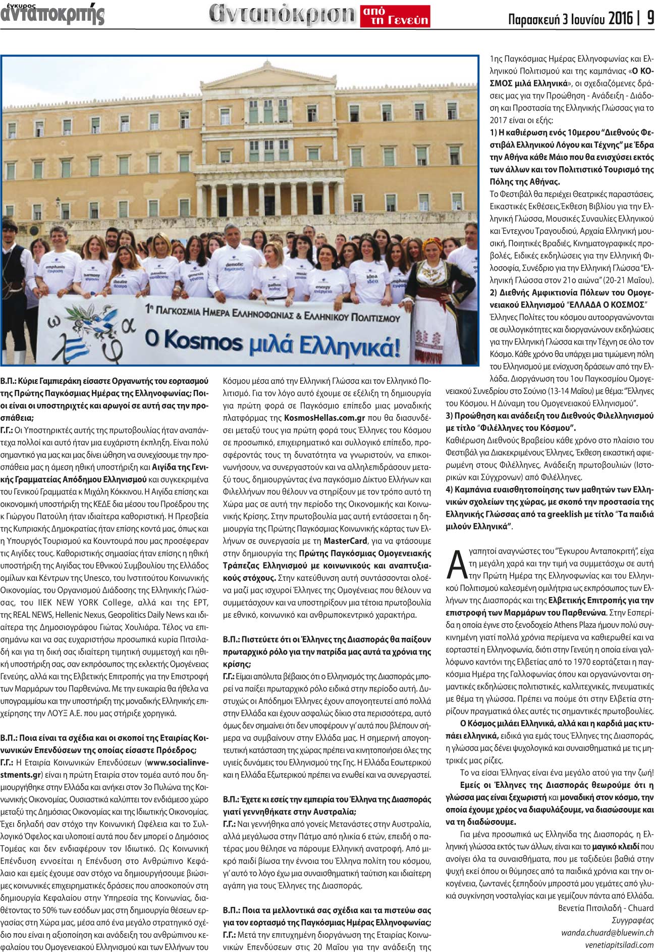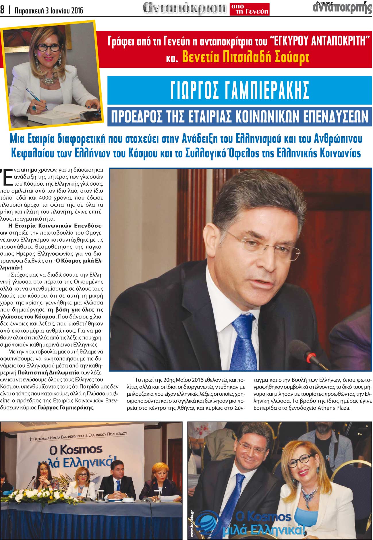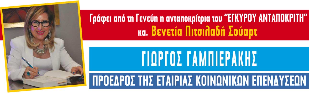 Η συγγραφέας κ. Βενετία Πιτσιλαδή Σούαρτ, ως ανταποκρίτρια τής εφημερίδας του Έγκυρου Ανταποκριτή από τη Γενεύη, συνομιλεί με τον πρόεδρο της Εταιρείας Κοινωνικών Επενδύσεων, κο Γιώργο Γαμπιεράκη.