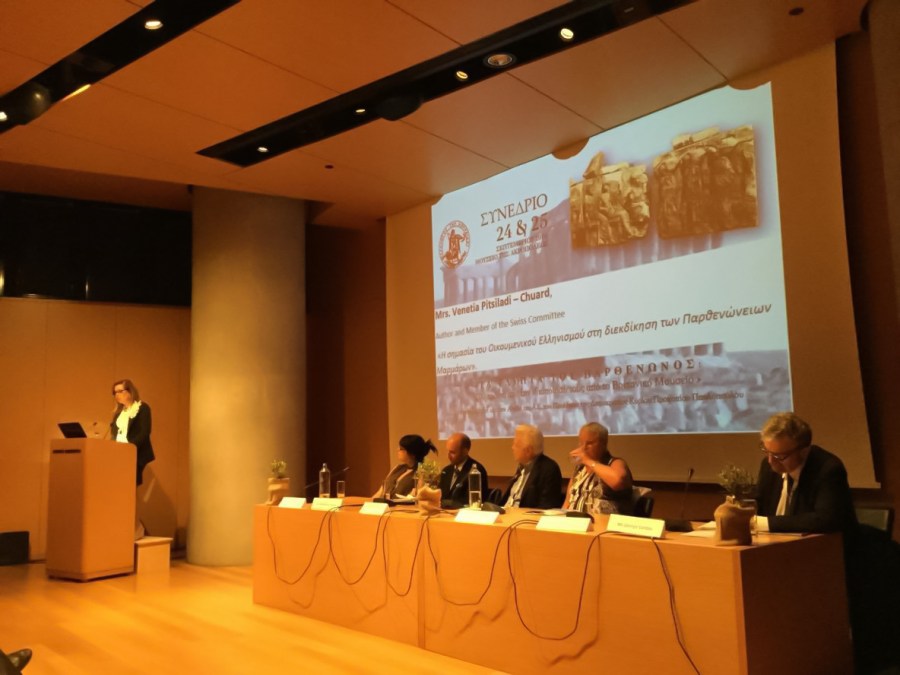 Στο Συνέδριο συμμετείχε ως μία εκ των ομιλητριών, η συγγραφέας Βενετία Πιτσιλαδή – Chuard, με την ιδιότητα του μέλους Ελβετικής Επιτροπής για την επιστροφή των Μαρμάρων. Θέμα της ομιλίας ήταν «Η σημασία του Οικουμενικού Ελληνισμού στην διεκδίκηση των Παρθενώνιων Μαρμάρων», την οποία και παραθέτουμε.