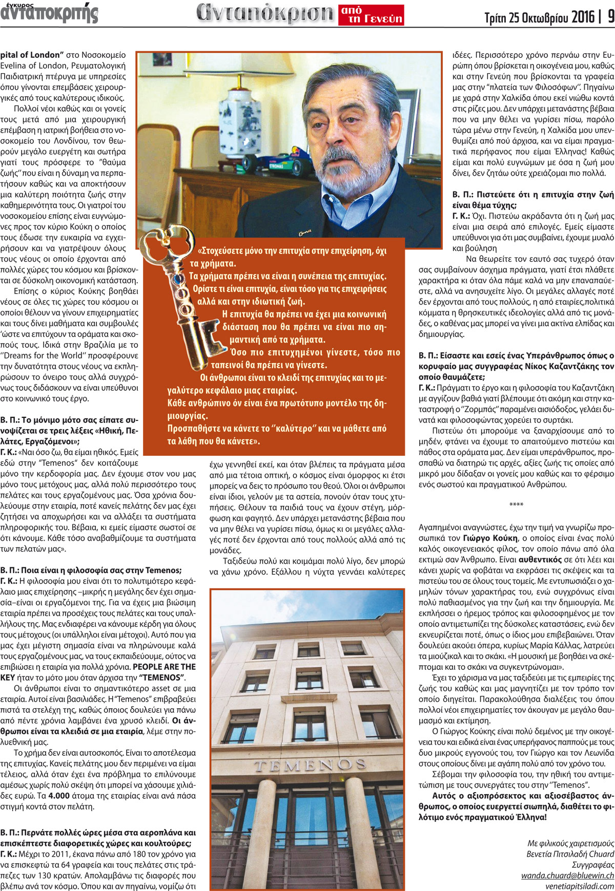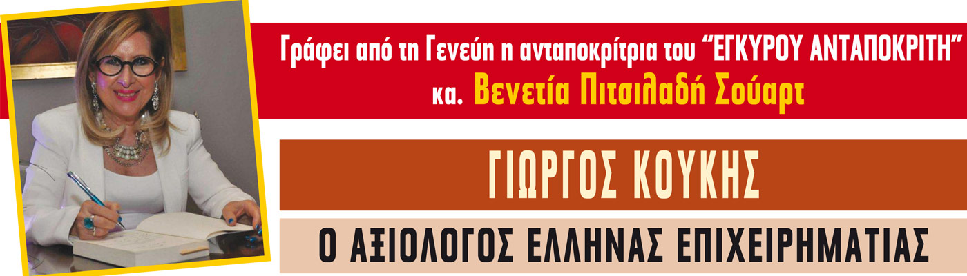 Η συγγραφέας κ. Βενετία Πιτσιλαδή Σούαρτ, ως ανταποκρίτρια τής εφημερίδας του Έγκυρου Ανταποκριτή από τη Γενεύη, συνομιλεί με Έλληνα επιχειρηματία Γιώργο Κούκη, αυτοδημιούργητο, πολυμήχανο, ανθρωπιστή και φιλάνθρωπο επιχειρηματία λογισμικού για τράπεζες ο οποίος με έδρα την Ελβετία διαπρέπει σε όλο τον κόσμο.