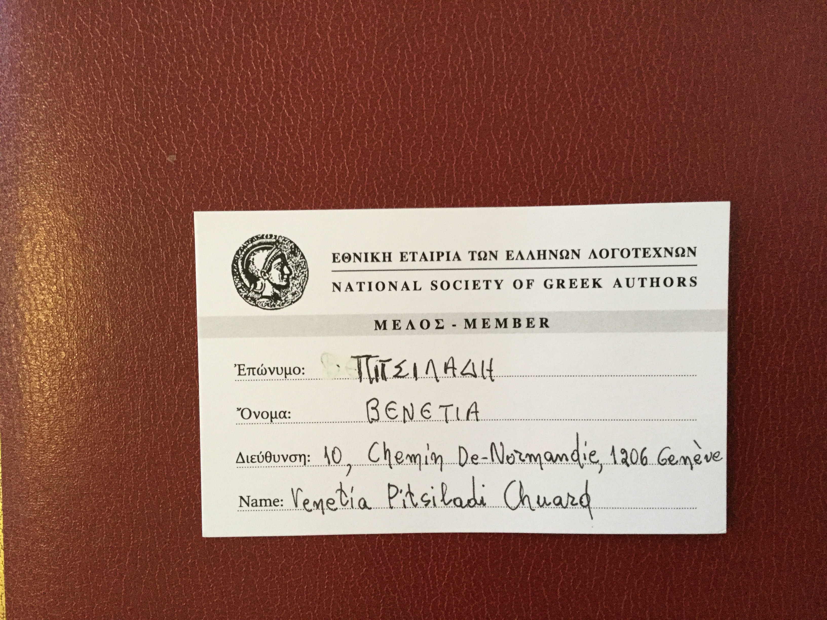 «Σας καλωσορίζουμε στην οικογένεια μας, σας συγχαίρουμε για την εκλογή σας και περιμένουμε τη δραστηριότητα σας στο έργο της Εταιρίας μας, καθώς και την παρουσία σας στις εκδηλώσεις μας», ήταν τα λόγια του Προέδρου της Εθνικής Εταιρείας Ελλήνων Λογοτεχνών κου Διονύση Μαγκλιβέρα προς τη συγγραφέα Βενετία Πιτσιλαδή Chuard, κατά την υποδοχή της ως νέο μέλος της Εταιρείας.