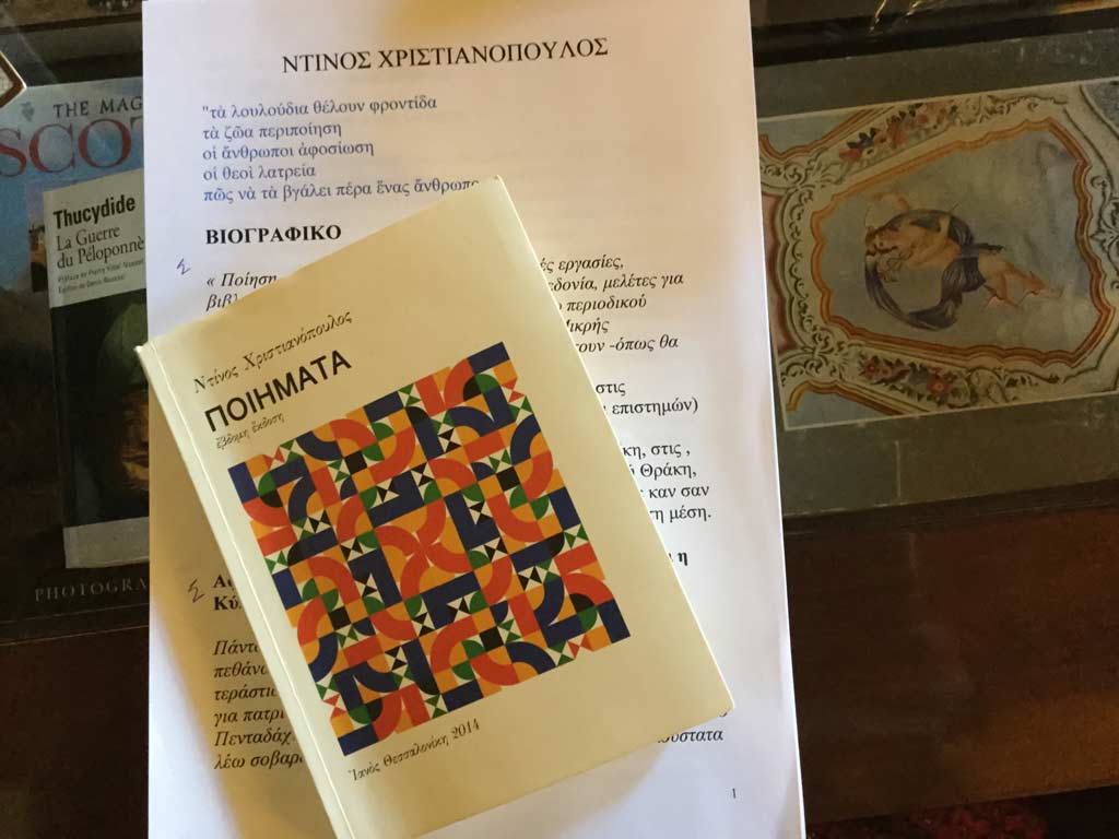 Πραγματοποιήθηκε στην κατοικία της κας Ρέας Πουρνάρα, η συνάντηση Μαρτίου του «Λογοτεχνικού Κύκλου Βιβλιόφιλων Γενεύης», όπου οι Βιβλιόφιλες Κάκια Τζανέτη και Σοφία Ματθοπούλου έκαναν μια εξαιρετική δραματοποιημένη παρουσίαση του ποιητή Ντίνου Χριστιανόπουλου.