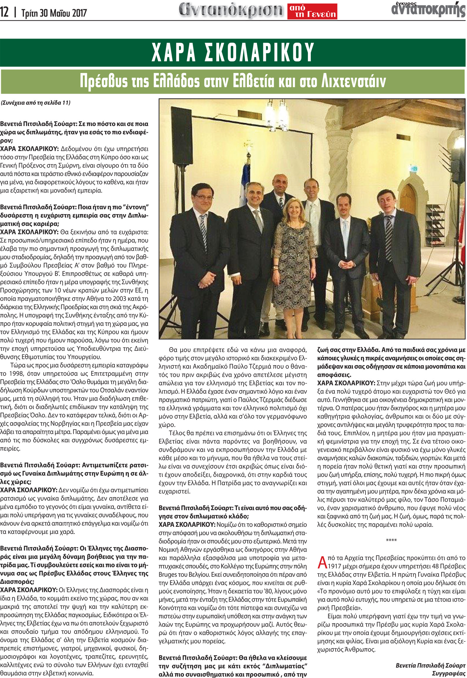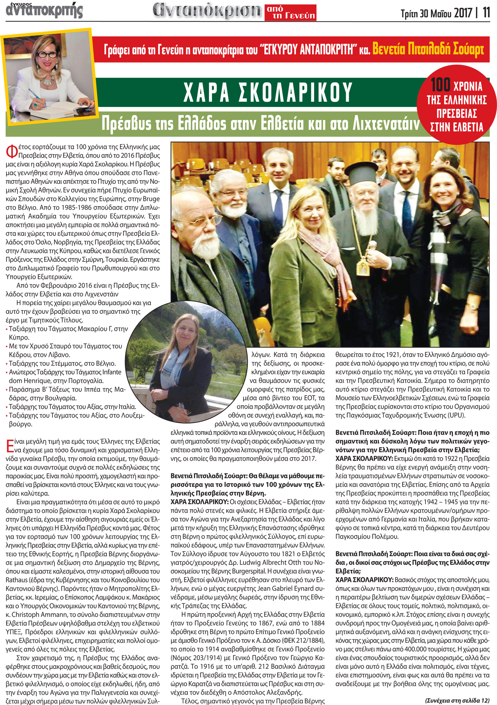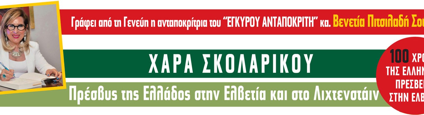 Η συγγραφέας κ. Βενετία Πιτσιλαδή Σούαρτ, ως ανταποκρίτρια τής εφημερίδας του Έγκυρου Ανταποκριτή από τη Γενεύη, με την ευκαιρία των 100 ετών της Ελληνικής Πρεσβείας στην Ελβετία, συνομιλεί με την Πρέσβυ της Ελλάδος στην Ελβετία και στο Λιχτενστάιν, κα Χαρά Σκολαρίκου.