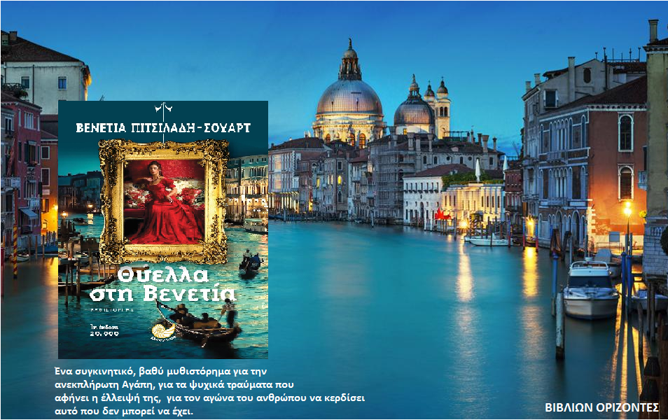 ”Θύελλα στην Βενετία” ο τίτλος του νέου βιβλίου της Βενετίας Πιτσιλαδή-Σούαρτ, ένα ατμοσφαιρικό, γεμάτο συγκινήσεις μυθιστόρημα, με γοητευτική γραφή και άμεσο λόγο, που διερευνά και αγγίζει με ιδιαίτερο τρόπο τις ευαισθησίες της ανθρώπινης ψυχής, εμπνέοντας τροφή για σκέψη στον αναγνώστη, που θα επιλέξει να ταξιδέψει μοναδικά, μέσα από τις σελίδες του.