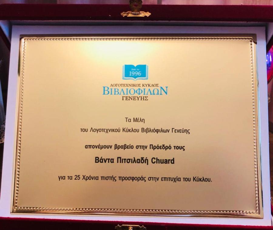 Ο Γενικός Πρόξενος της Ελλάδας στη Γενεύη, Αλέξανδρος Γεννηματάς, απηύθυνε συγχαρητήρια στον Λογοτεχνικό Κύκλο Βιβλιόφιλων Γενεύης για τα 25 χρόνια λειτουργίας του, υπό τον ικανό συντονισμό της συγγραφέως Βάντας Πιτσιλαδή-Chuard, ευχόμενος στα μέλη του όπως συνεχίσουν το δημιουργικό τους έργο και τα επόμενα 25 χρόνια.