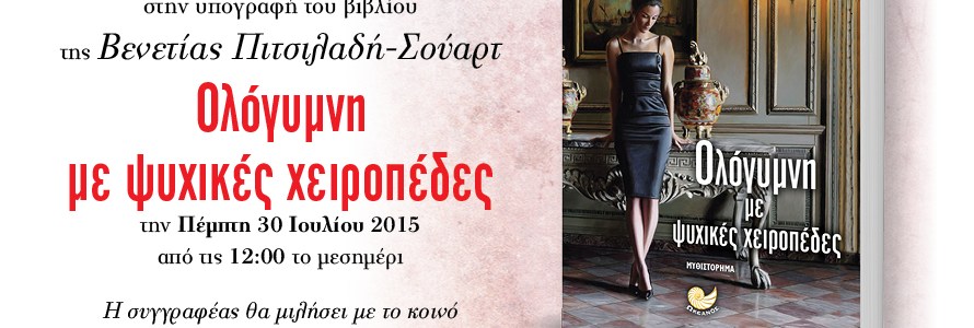 Στις 30 Ιουλίου 2015, στο χώρο των καταστημάτων Hondos στη Γλυφάδα, πραγματοποιήθηκε εκδήλωση υπογραφής αντιτύπων τού μυθιστορήματος «Ολόγυμνη με ψυχικές χειροπέδες». Παραβρέθηκαν φίλοι και αναγνώστες-ριες με τους οποίους, πέρα από τις υπογραφές, είχα τη χαρά να γνωριστώ και να ανταλλάξω σκέψεις για το ίδιο το βιβλίο αλλά και γενικότερα, μιας και η κοινωνική επικαιρότητα στη… Read More Υπογραφές αντιτύπων τού βιβλίου «Ολόγυμνη με ψυχικές χειροπέδες» στο χώρο των καταστημάτων Hondos στη Γλυφάδα